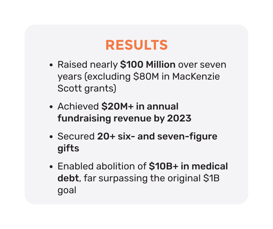 In 2016, Donorly began its first engagement with a health equity nonprofit abolishing medical debt, then a newly formed nonprofit, through a small research project. What started as a focused effort to identify donor prospects quickly grew into a long-term partnership that transformed the organization’s fundraising capacity and impact.